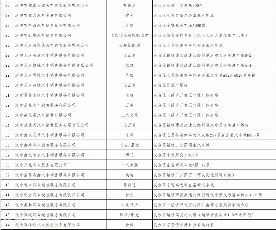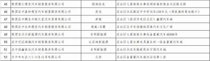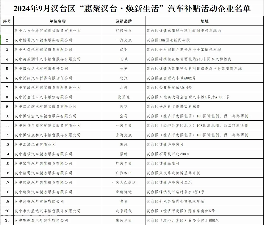 附件:汉台区9月“惠聚汉台·焕新生活”汽车消费补贴活动企业名单