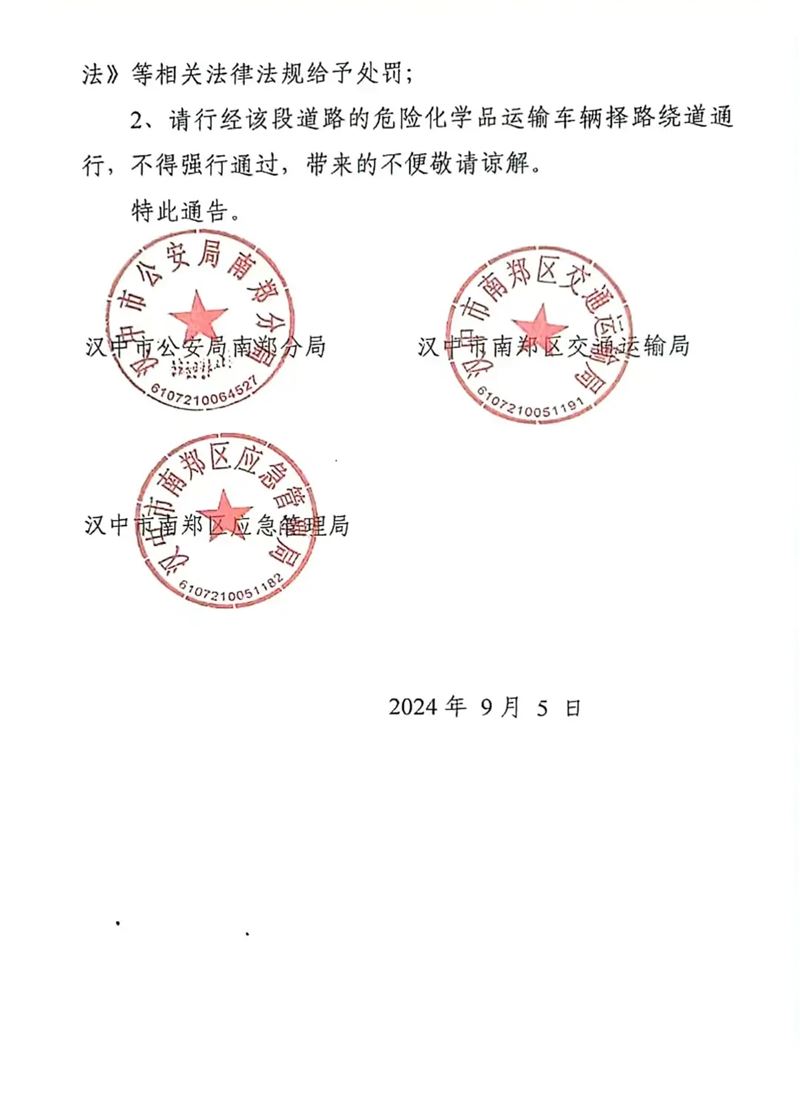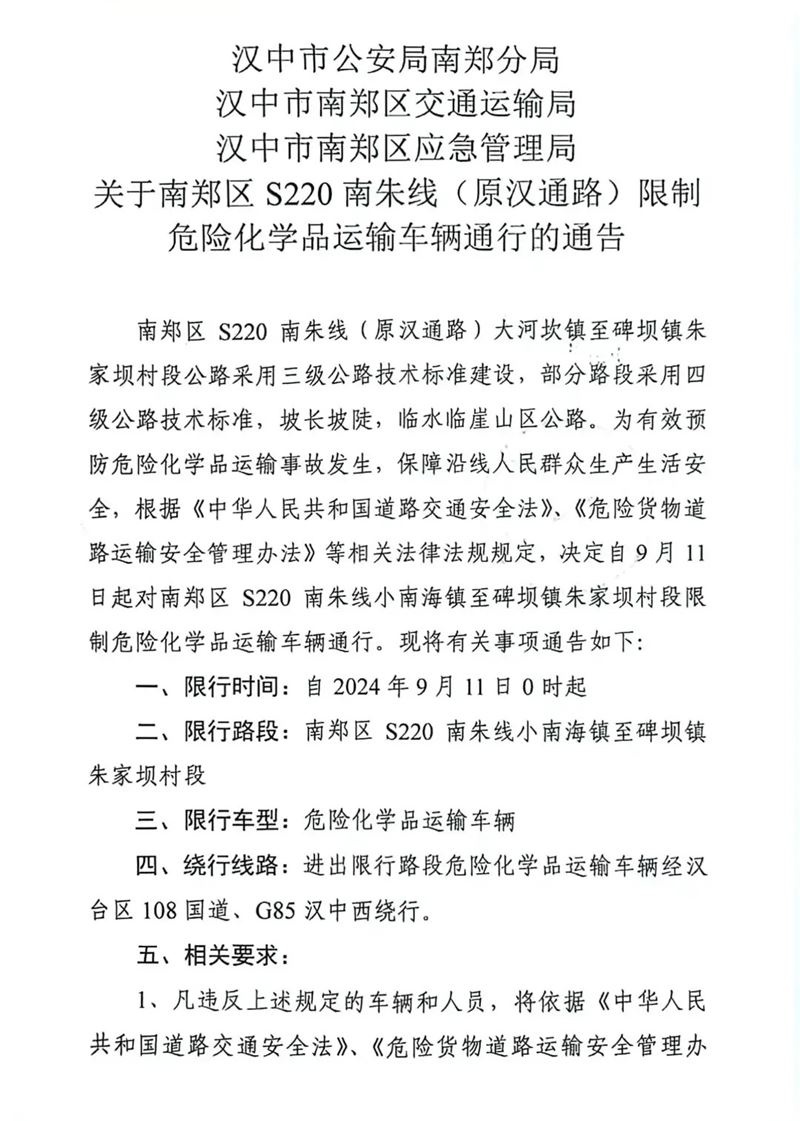 关于南郑区 S220 南朱线(原汉通路)限制危险化学品运输车辆通行的通告