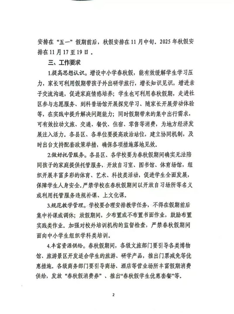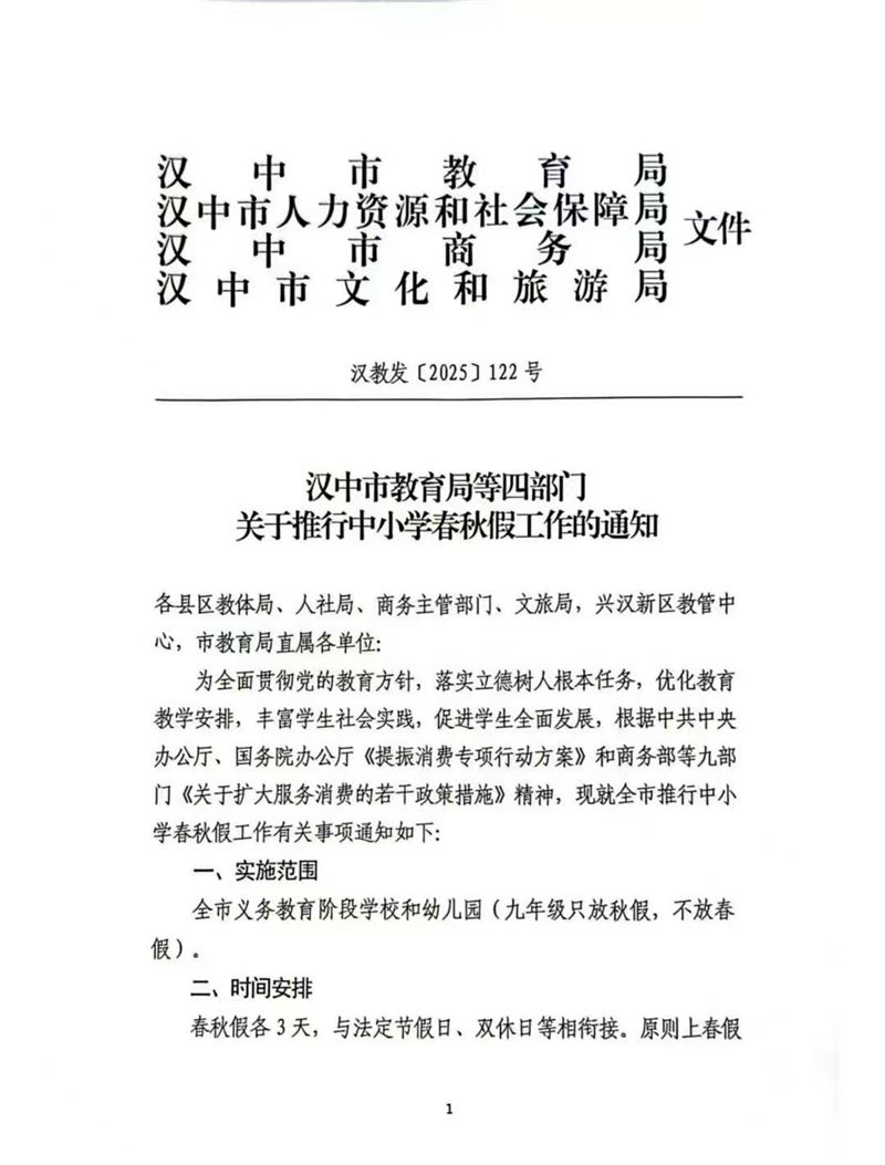 近日,汉中市教育局、汉中市人力资源和社会保障局、汉中市商务局、汉中市文化和旅游局四部门联合发布《汉中市教育局等四部门关于推行中小学春秋假工作的通知》(以下简称《通知》),正式推行中小学春秋假工作。《通