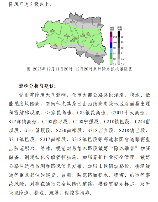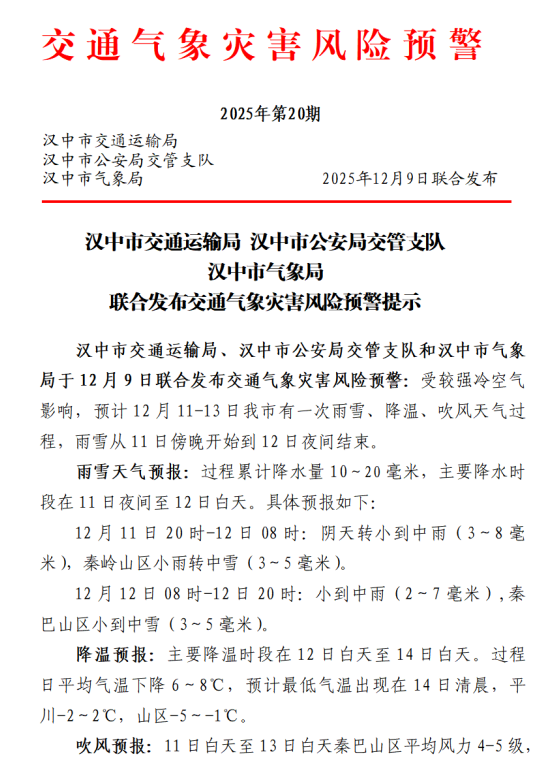 汉中市交通运输局、汉中市公安局交管支队和汉中市气象局于12月9日联合发布交通气象灾害风险预警:受较强冷空气影响,预计12月11-13日我市有一次雨雪、降温、吹风天气过程,雨雪从11日傍晚开始到12日夜