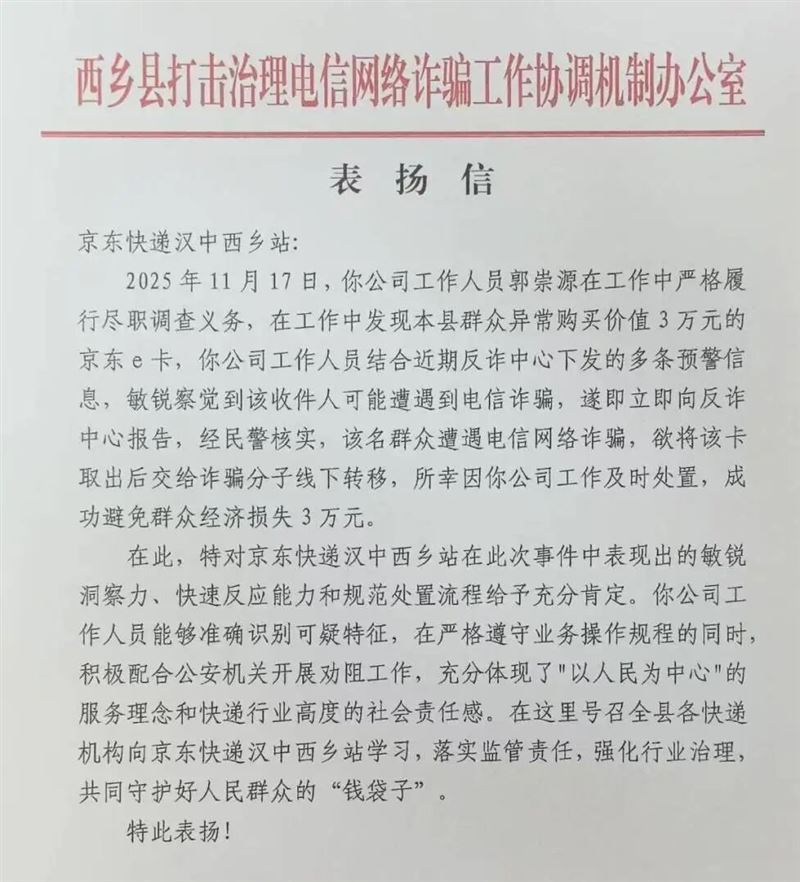 近日,汉中市快递行业党委通报表扬了陕西京东汉中分公司西乡营业部,肯定其在反诈工作中发挥的行业前哨作用。这源于该营业部快递员郭崇源的一次关键警觉。11月17日,京东快递汉中西乡站快递员郭崇源在整理快递时