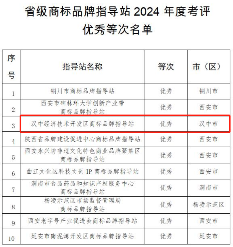 近日,陕西省知识产权局发布《省级商标品牌指导站2024年度考评优秀等次名单公示》。汉中1个指导站入选详细名单如下