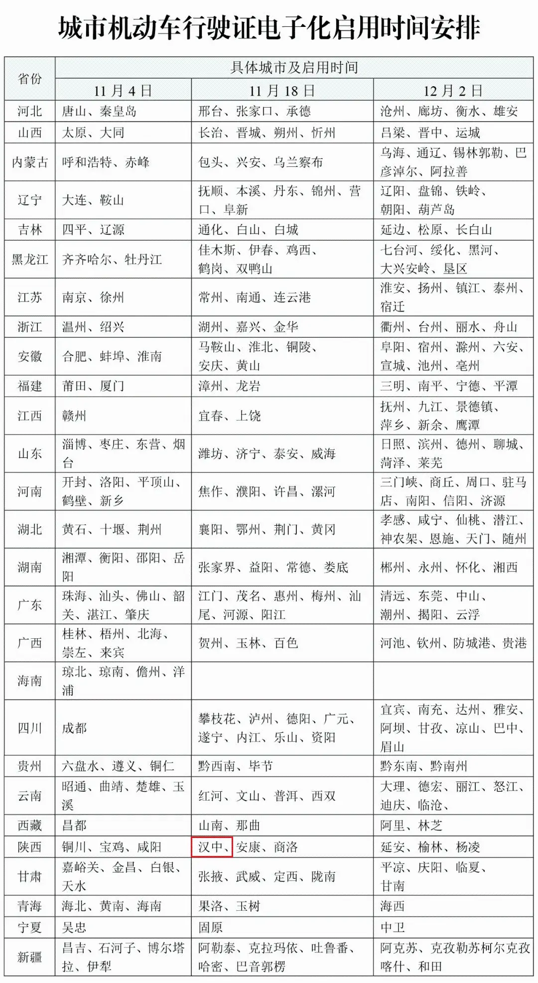 近日,公安部部署,自11月4日至12月2日,在全国分三批全面推广应用机动车行驶证电子化,车主可对照本地启用时间安排,通过全国统一的“交管12123”APP申领电子行驶证,其中,汉中将于11月18启用,