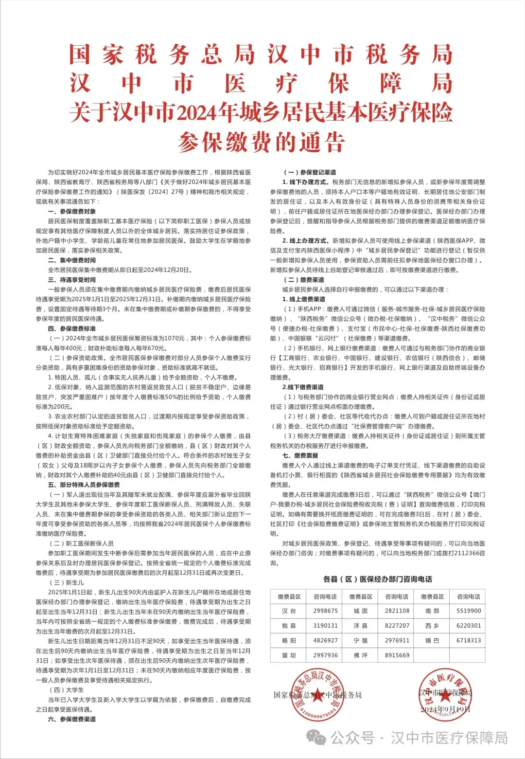 汉中市2024年城乡居民基本医保参保缴费开始了!参保人员可以通过:微信(服务-城市服务-社保-城乡居民医疗保险缴纳)、“陕西税务”微信公众号(微办税-社保缴纳)、“汉中税务”微信公众号(便捷办税-社保