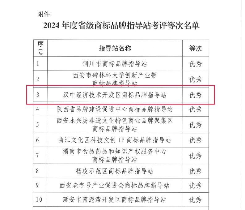 近日,陕西省知识产权局发布了2024年度省级商标品牌指导站考评优秀等次名单,全省共有10家商标品牌指导站获得优秀评价,其中汉中经济技术开发区商标品牌指导站成为陕南地区唯一入选站点。在汉中市市场监管局支