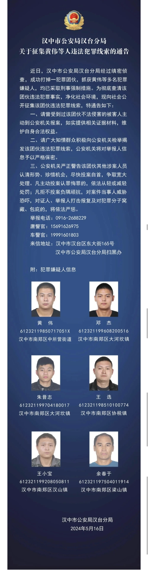 近日,汉中市公安局汉台分局经过缜密侦查,成功打掉一犯罪团伙,抓获黄伟等多名犯罪嫌疑人,均已采取刑事强制措施。为彻底查清该团伙违法犯罪事实,净化社会环境,现向社会公开征集该团伙违法犯罪线索,特通告如下: