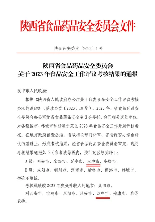 日前,陕西省食品药品安全委员会印发通报,汉中市人民政府2023年食品安全评议考核等级为A级,这是自2020年以来,汉中市食品安全工作评议考核成绩连续四年获得此殊荣。近年来,汉中市委、市政府高度重视食品