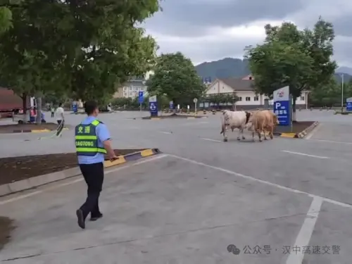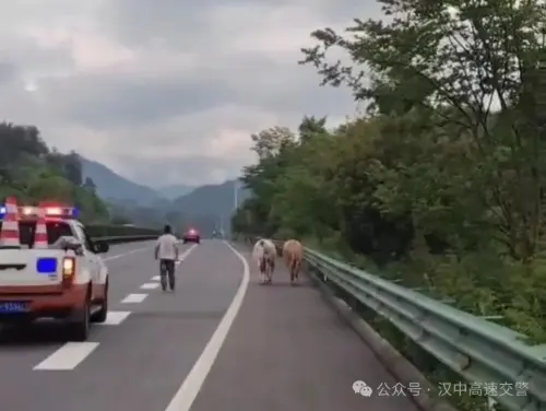 5月9日下午18时许,汉中高交大队勉县中队接到群众报警称,银昆高速巴中方向,天汉水城服务区附近,有两头牛在高速公路上穿行,影响行车安全。民警立即出警,并及时联系路产养护人员共同处置。到达现场后,路产养