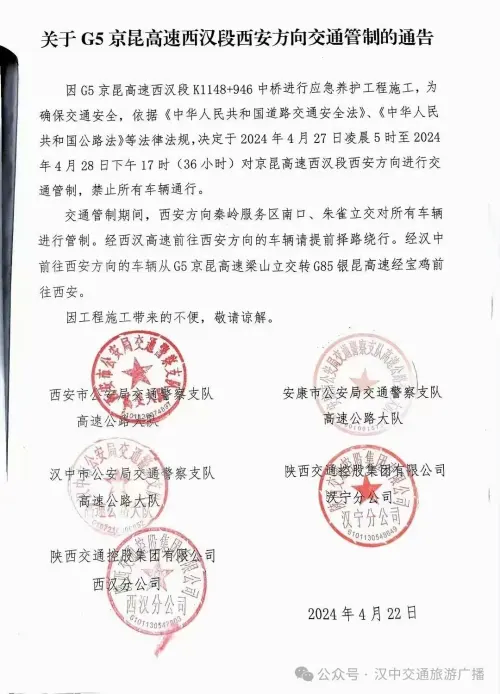 因G5京昆高速西汉段K1148+946中桥进行应急养护工程施工,为确保交通安全,依据《中华人民共和国道路交通安全法》、《中华人民共和国公路法》等法律法规,决定于2024年4月27日凌晨5时至2024年