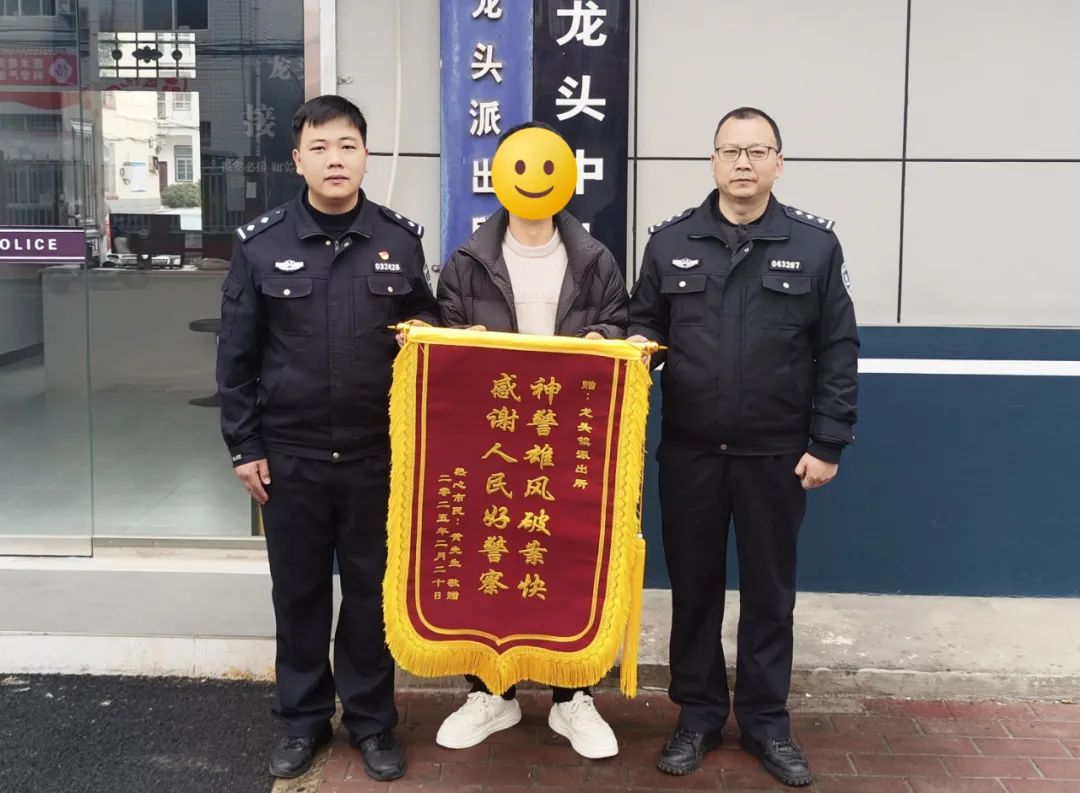 2月20日,群众黄先生来到龙头派出所将一面印有“神警雄风破案快、感谢人民好警察”的锦旗送到了民警手中,对民警帮助其母亲追回被骗资金表示感谢。